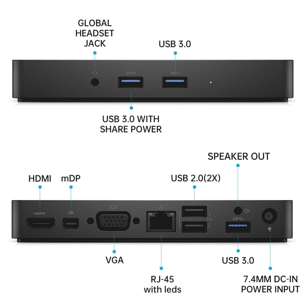 VGA, mDP, HDMI, RJ-45, 3x USB 3.0, 2x USB 2.0, Audio combo, Audio out, DC-in